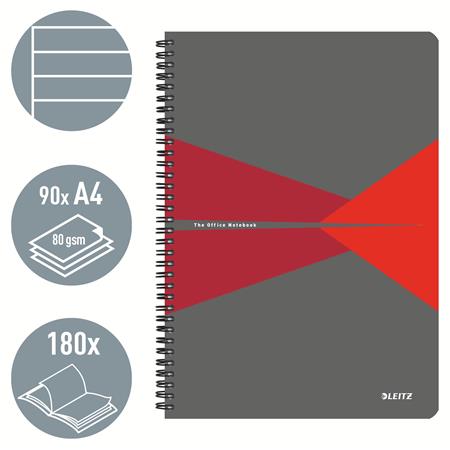 Spirálfüzet, A4, vonalas, 90 lap, laminált karton borító, LEITZ "Office", szürke-piros